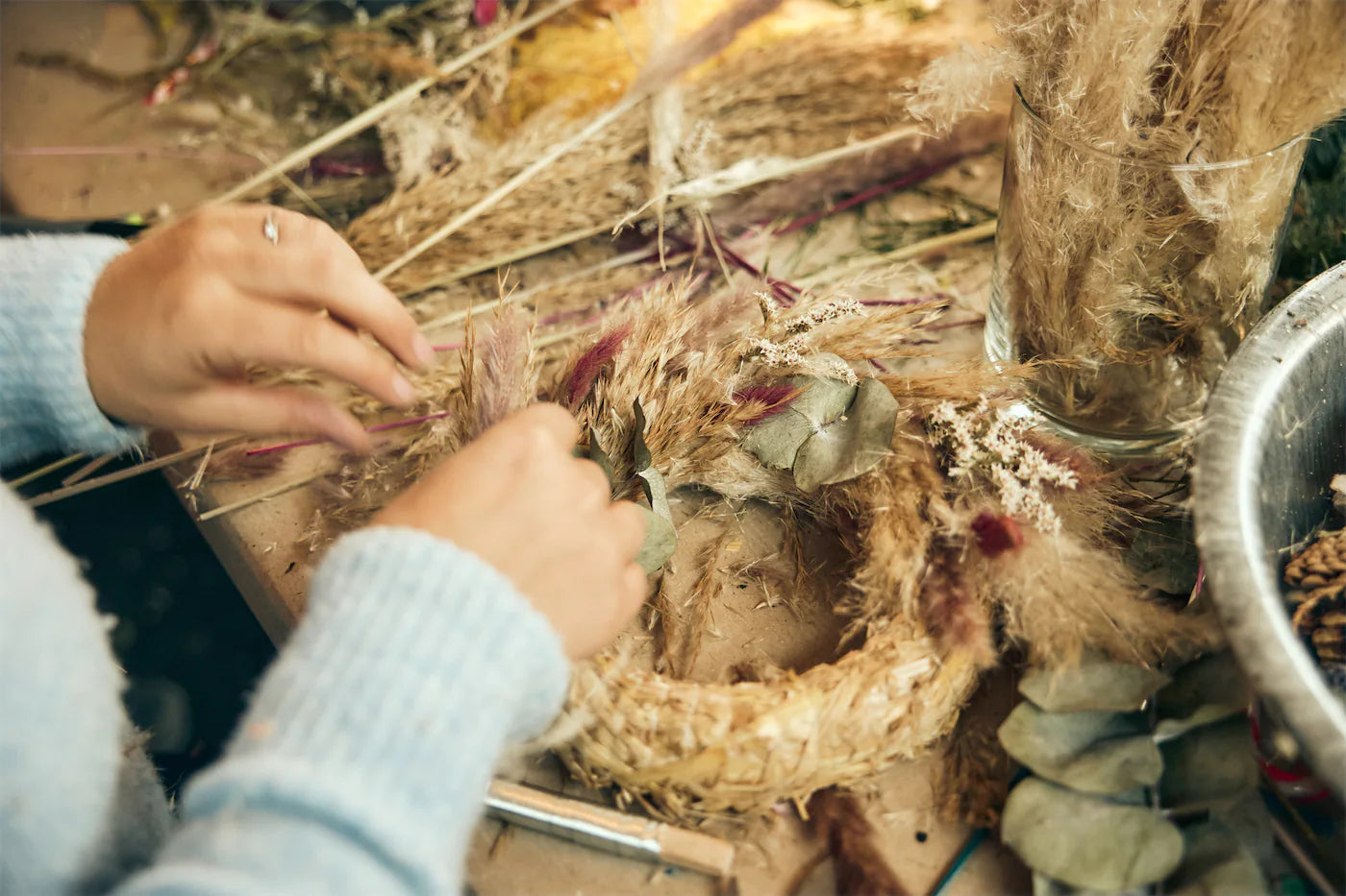 In diesem Workshop bindest Du, Schritt für Schritt, Deinen eigenen Herbstkranz aus Trockenblumen und saisonalen Naturmaterialien. Kreativ sein, abschalten und einen stilvollen, langlebigen Hingucker für Tisch oder Tür mit nach Hause nehmen.